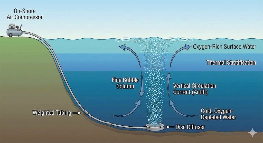 Kako radi: Kako se mjehurići dižu, stvaraju efekt "podizanja" koji se naziva zračni lift. To povlači vodu osiromašenu kisikom s dna na površinu u interakciju s atmosferom, učinkovito razbijajući toplinska stratifikacija i oksigenaciju cijelog vodenog stupca.