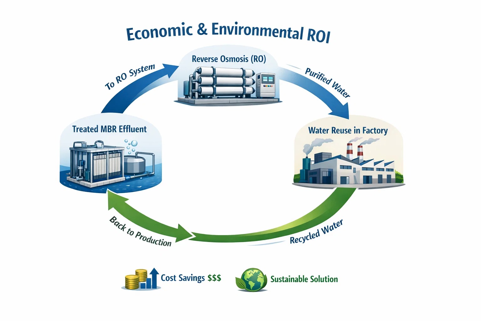 Za farmaceutsku i tekstilnu industriju voda je ogroman opći trošak. Otpadna voda MBR-a toliko je čista da može poslužiti kao izravno napajanje Reverzna osmoza (RO) .