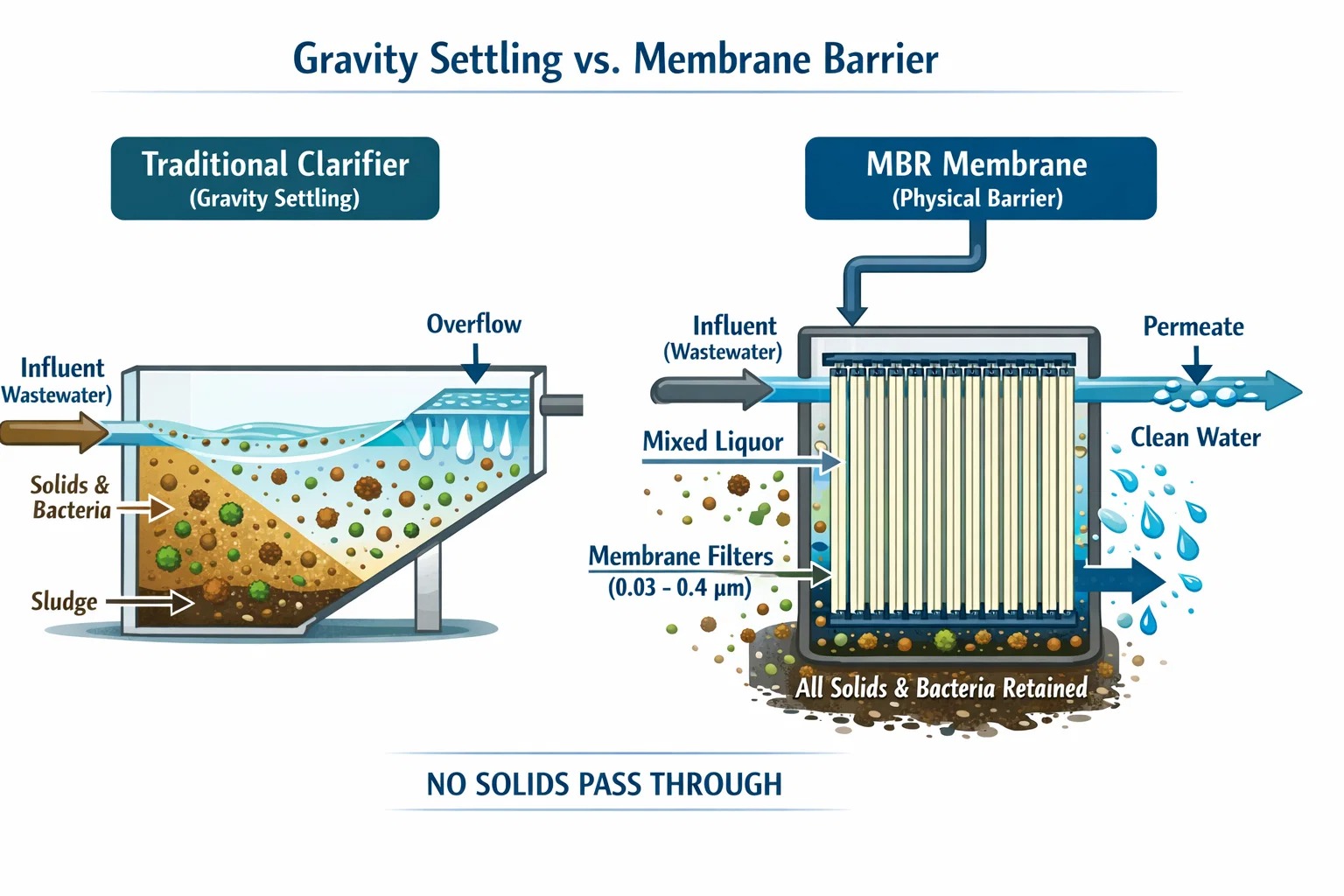 U konvencionalnom postrojenju ograničeni ste brzinom kojom čestica može potonuti. U MBR-u koristimo a fizička membranska barijera (obično 0,03 do 0,4 μm).